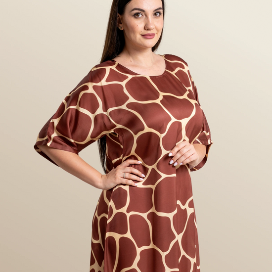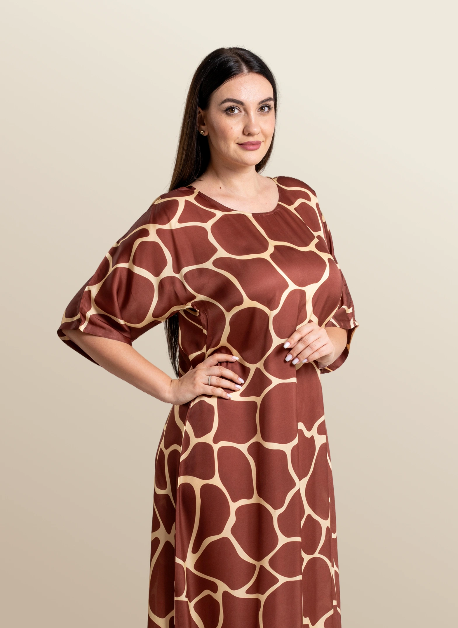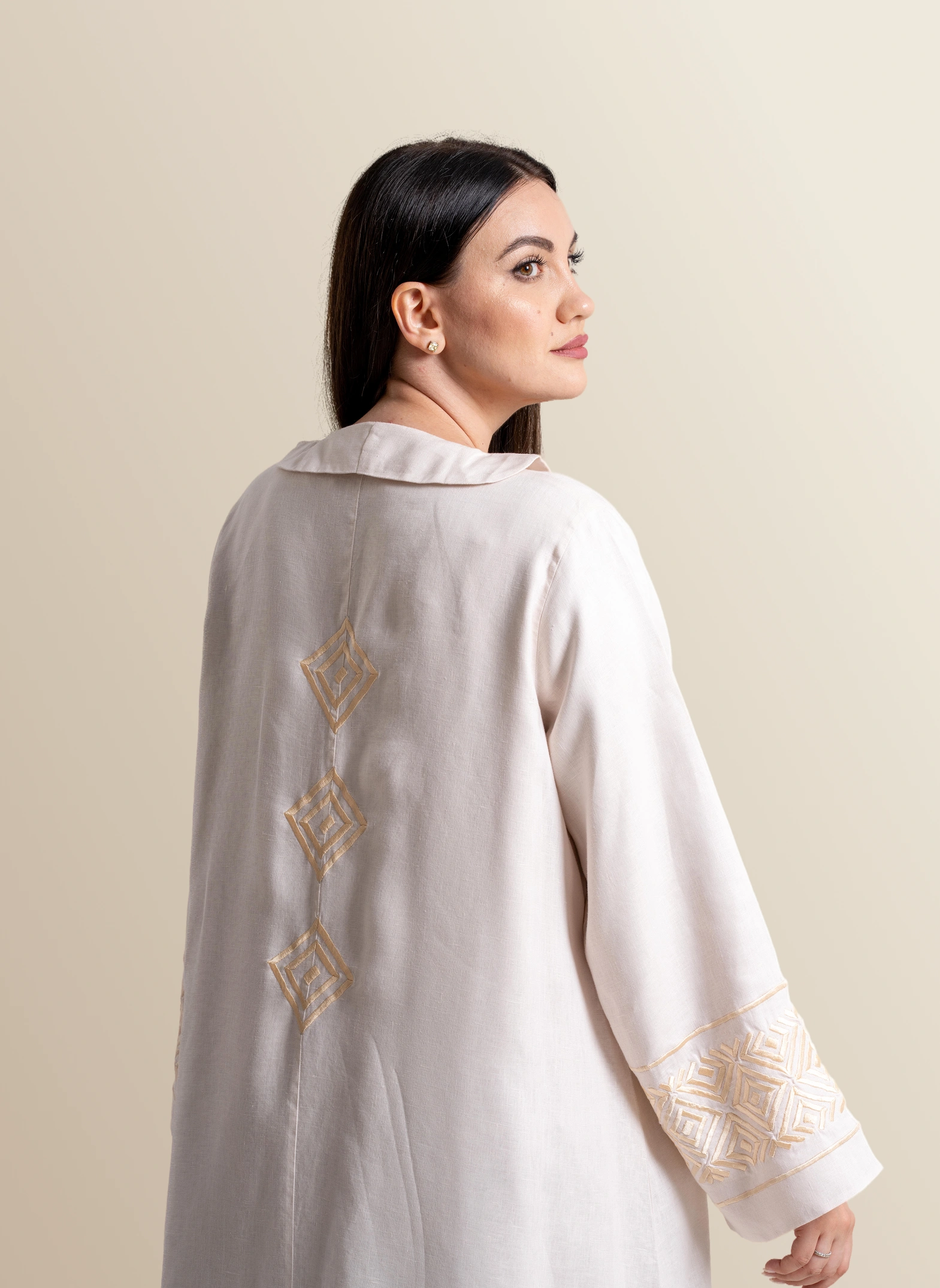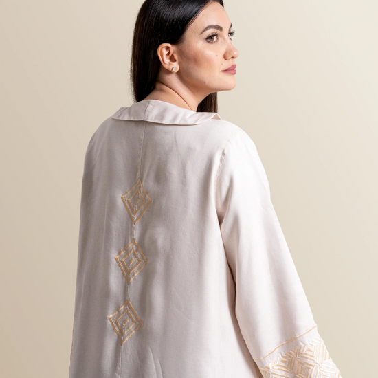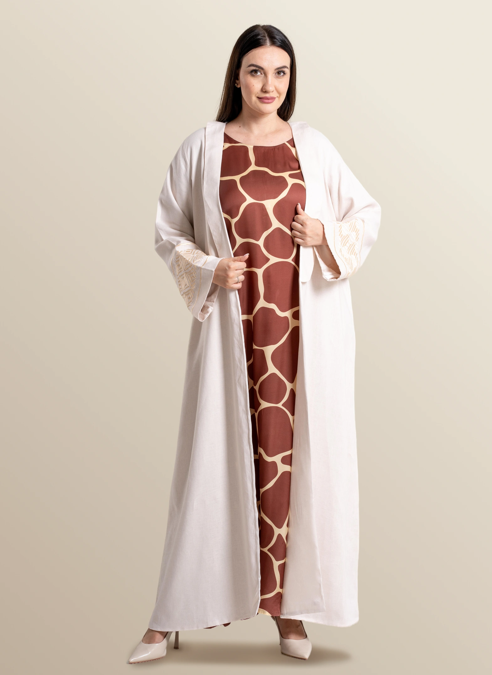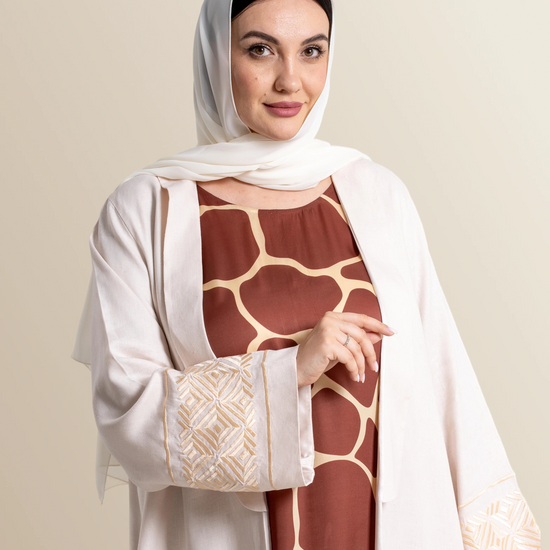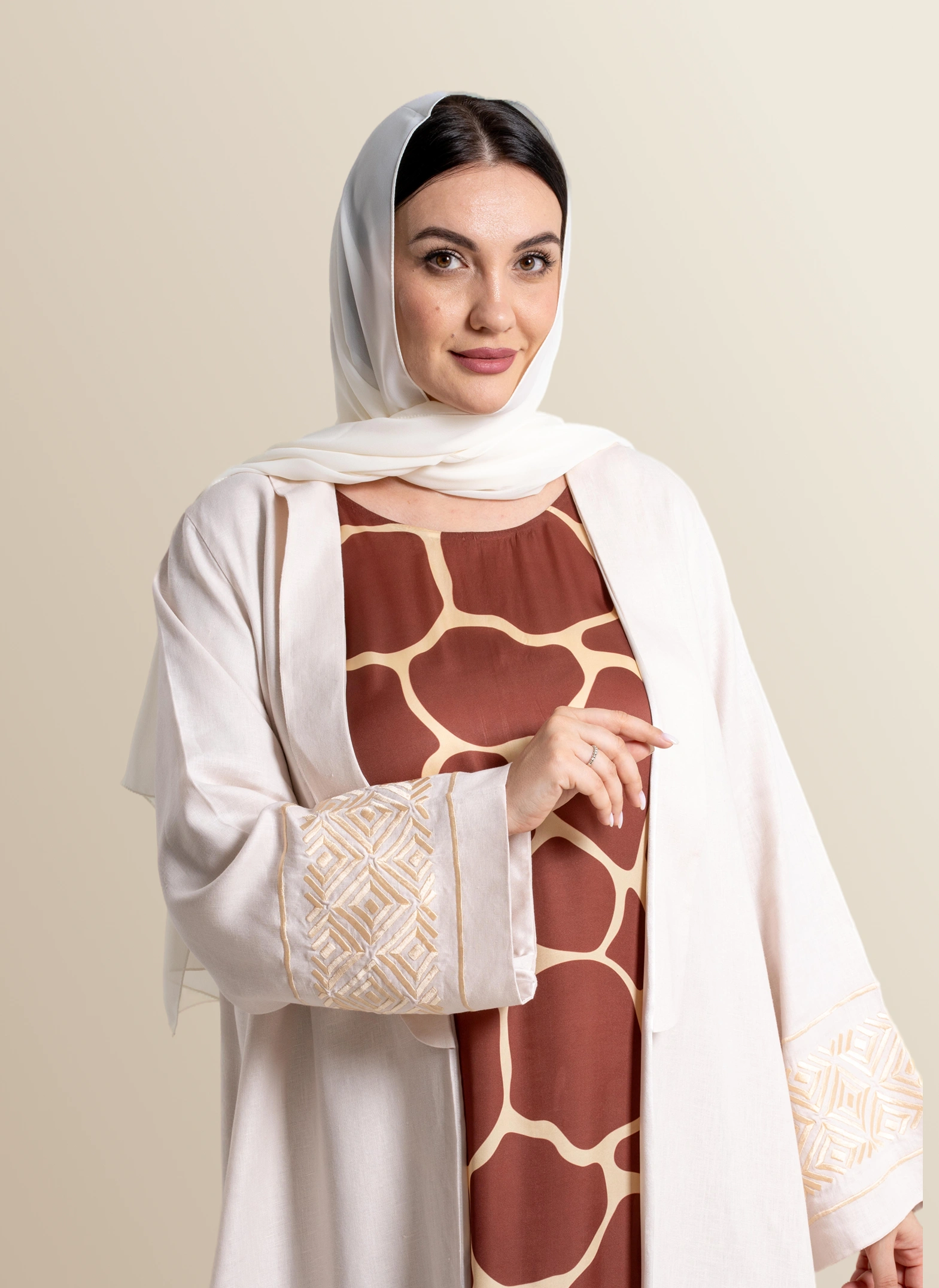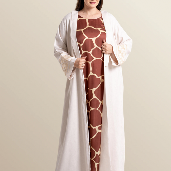 This luxury abaya was inspired by a sunrise Ulusaba game-drive through the Sabi Sands in South Africa - where giraffes stretched into silence and golden dust carried the morning light.